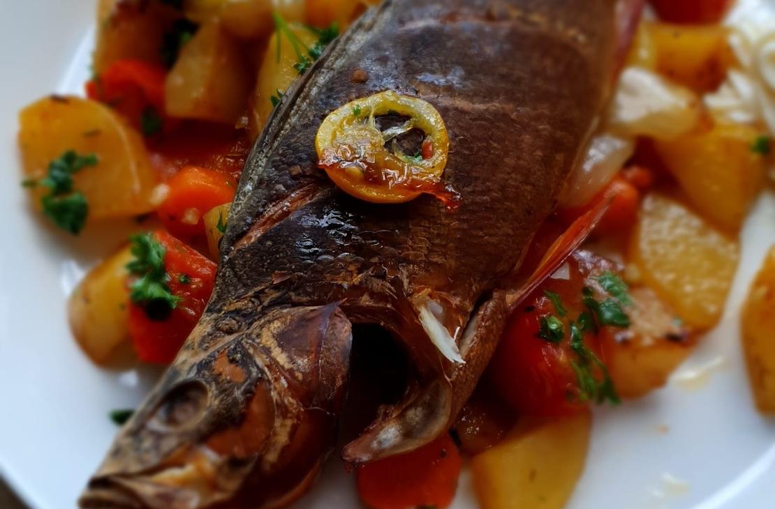◦ Gebratener Fisch, Gemüse der Saison und Soße
