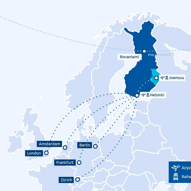 International flights arrive to Helsinki and there are good connections from Helsinki to Joensuu, Kuopio and Kajaani.