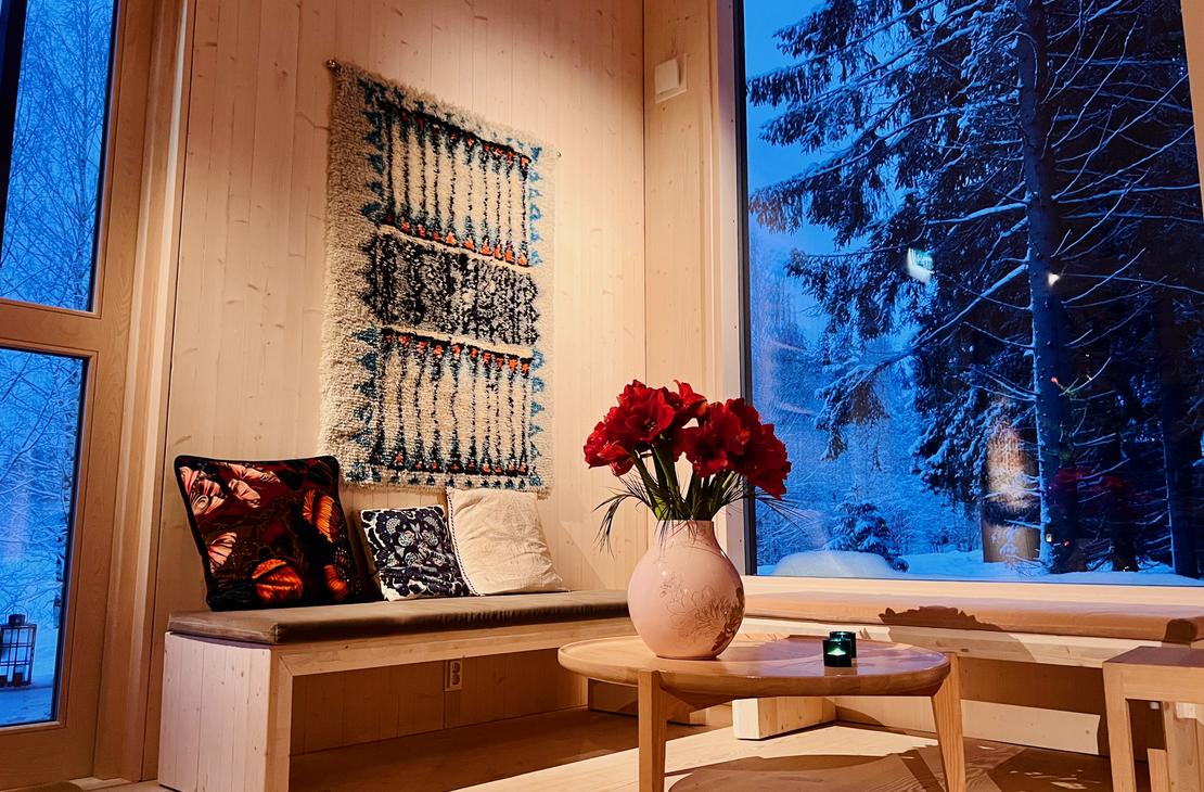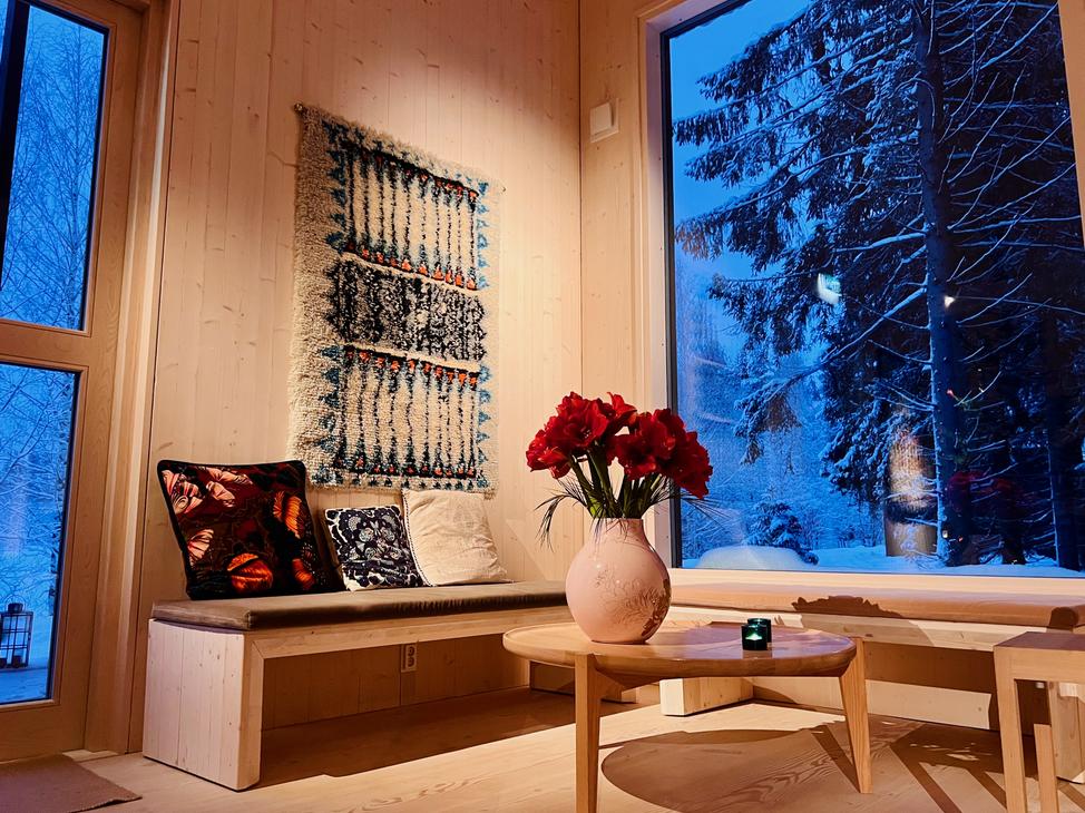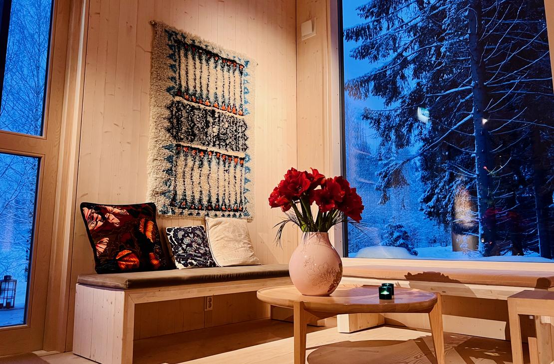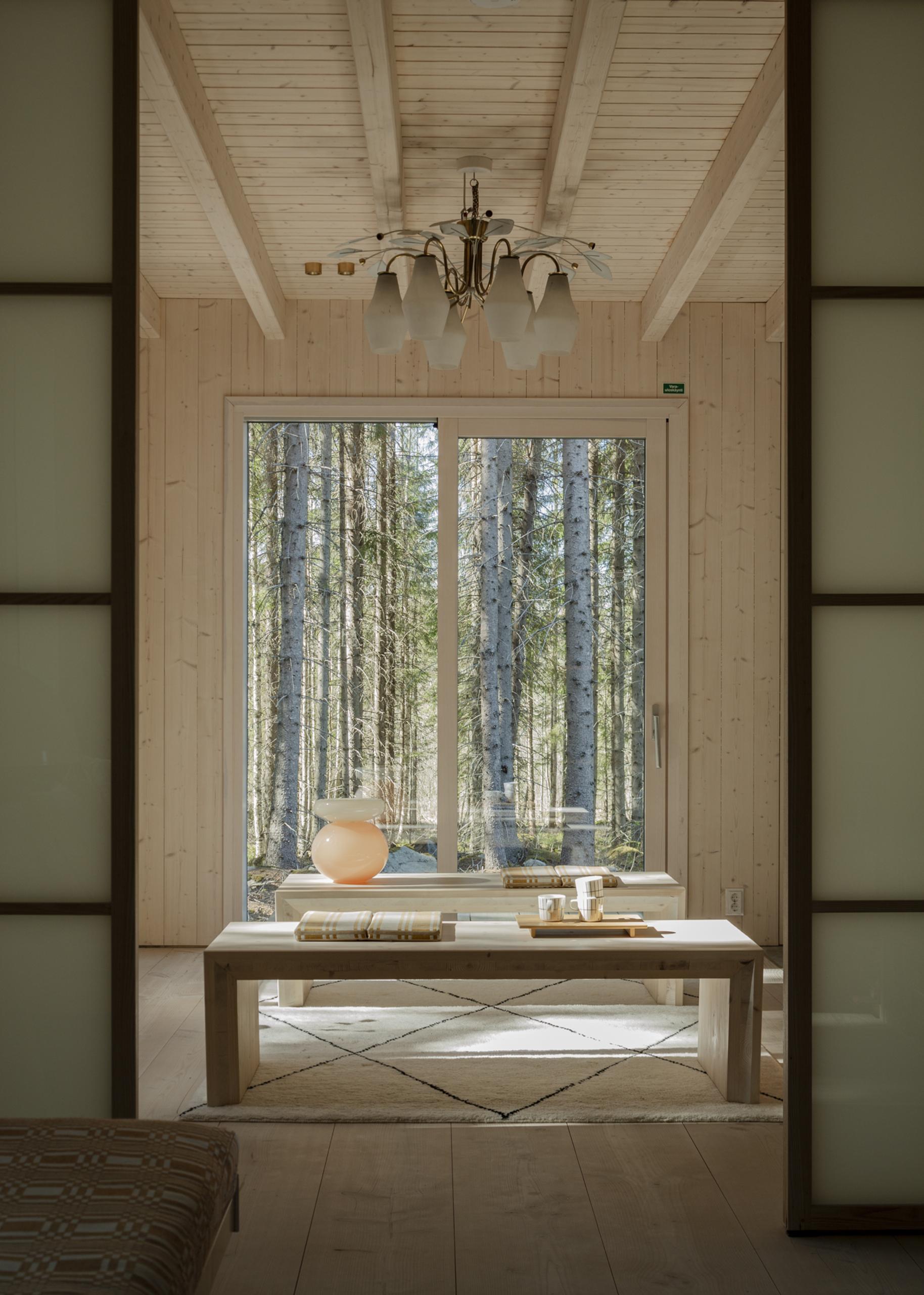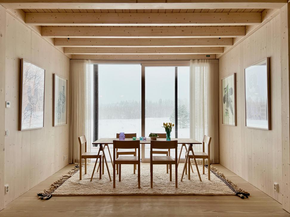 Interior Elegance: Where Scandinavian Simplicity Meets Sophistication Step into Usva House and immerse yourself in a world of Scandinavian elegance. The interiorsfeature a soothing palette of light-toned wood, creating a serene atmosphere. Handpicked Finnish furniture by Nikari and Artek, along with exclusive Kosmos pieces, adorn the space. Traditional and modern textiles add texture, while the banquet hall’s art tapestries, velvet-upholstered benches, and luxurious wool rugs exude understated opulence. Details like Italian marble in the kitchen and bathrooms elevate the ambiance, while floor-to-ceiling windows frame breathtaking vistas of spruce forests and meadows, transforming with the seasons.