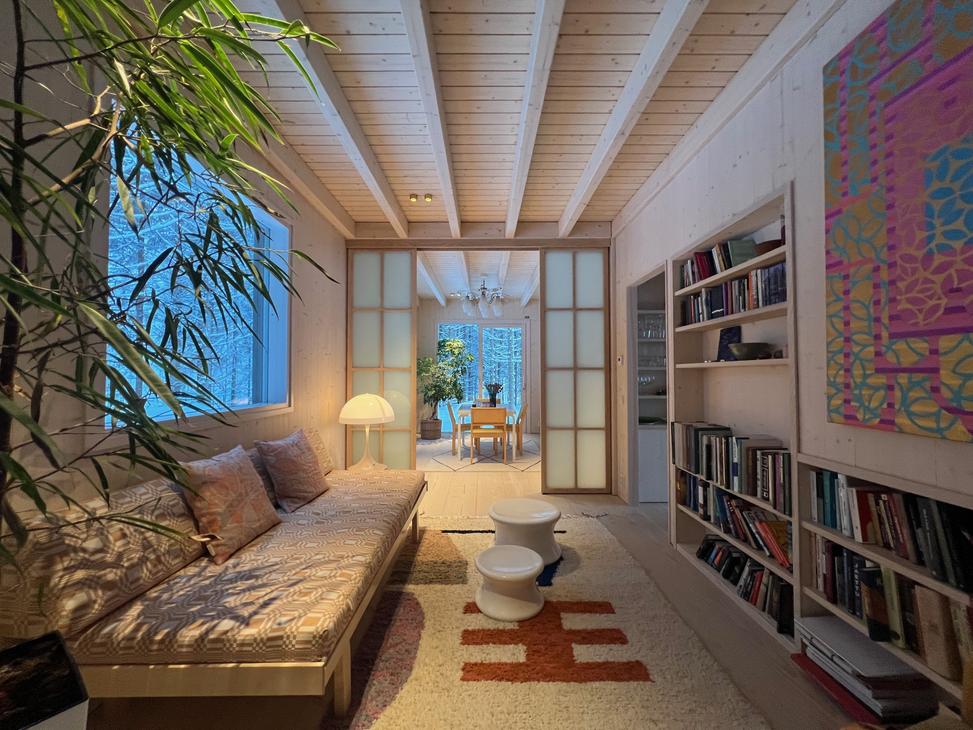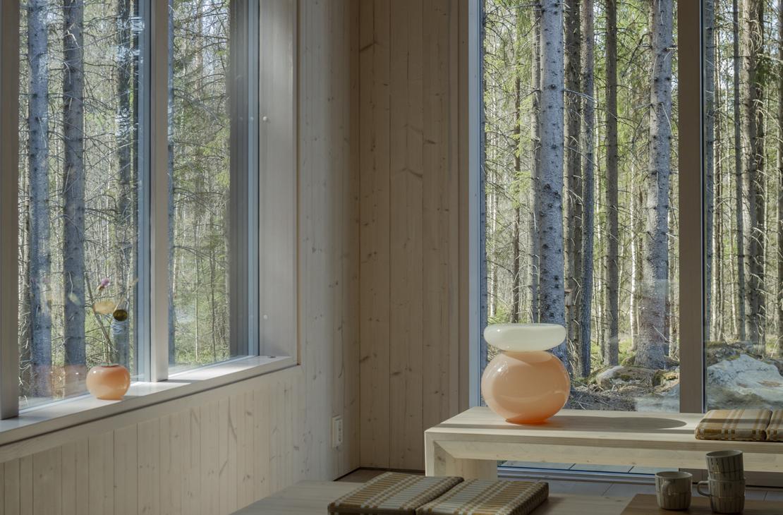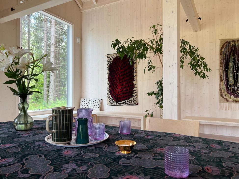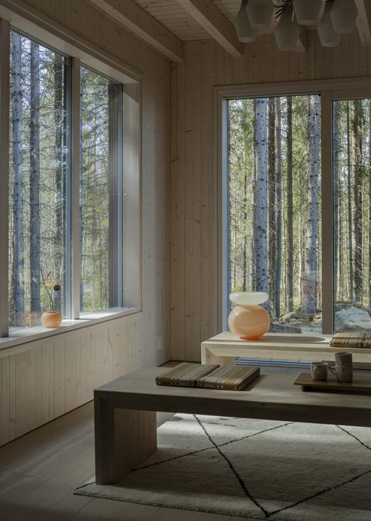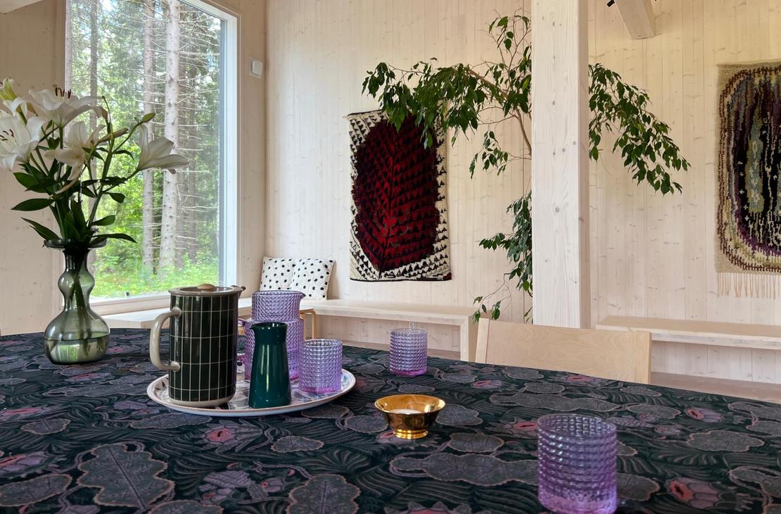 Interior Elegance: Where Scandinavian Simplicity Meets Sophistication Step into Usva House and immerse yourself in a world of Scandinavian elegance. The interiorsfeature a soothing palette of light-toned wood, creating a serene atmosphere. Handpicked Finnish furniture by Nikari and Artek, along with exclusive Kosmos pieces, adorn the space. Traditional and modern textiles add texture, while the banquet hall’s art tapestries, velvet-upholstered benches, and luxurious wool rugs exude understated opulence. Details like Italian marble in the kitchen and bathrooms elevate the ambiance, while floor-to-ceiling windows frame breathtaking vistas of spruce forests and meadows, transforming with the seasons.