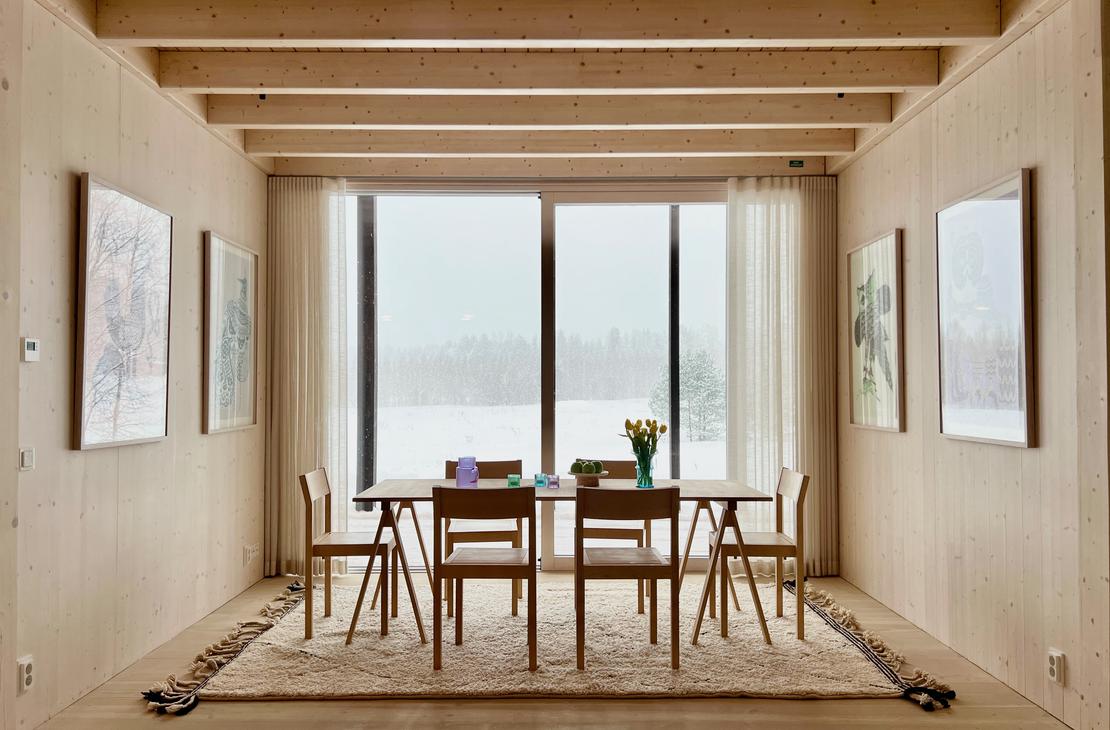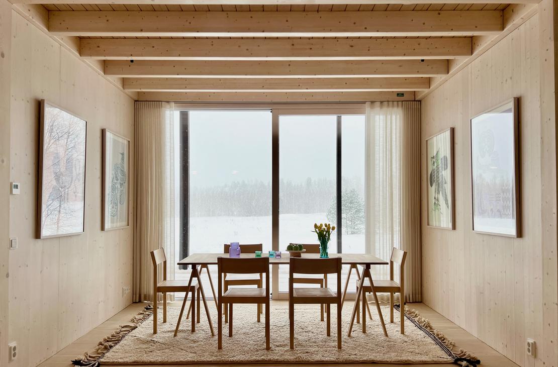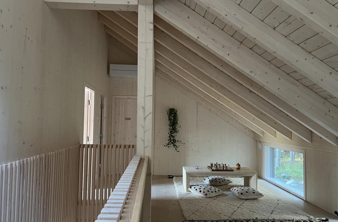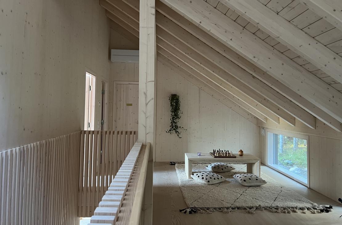 Constructed entirely of sustainable Finnish wood, the building’s materials are sourced from the region. Wall panels come from Crosslam’s Kainuu factory, while the downstairs ceilings are crafted from spruce trees felled on-site and processed by a local sawmill.