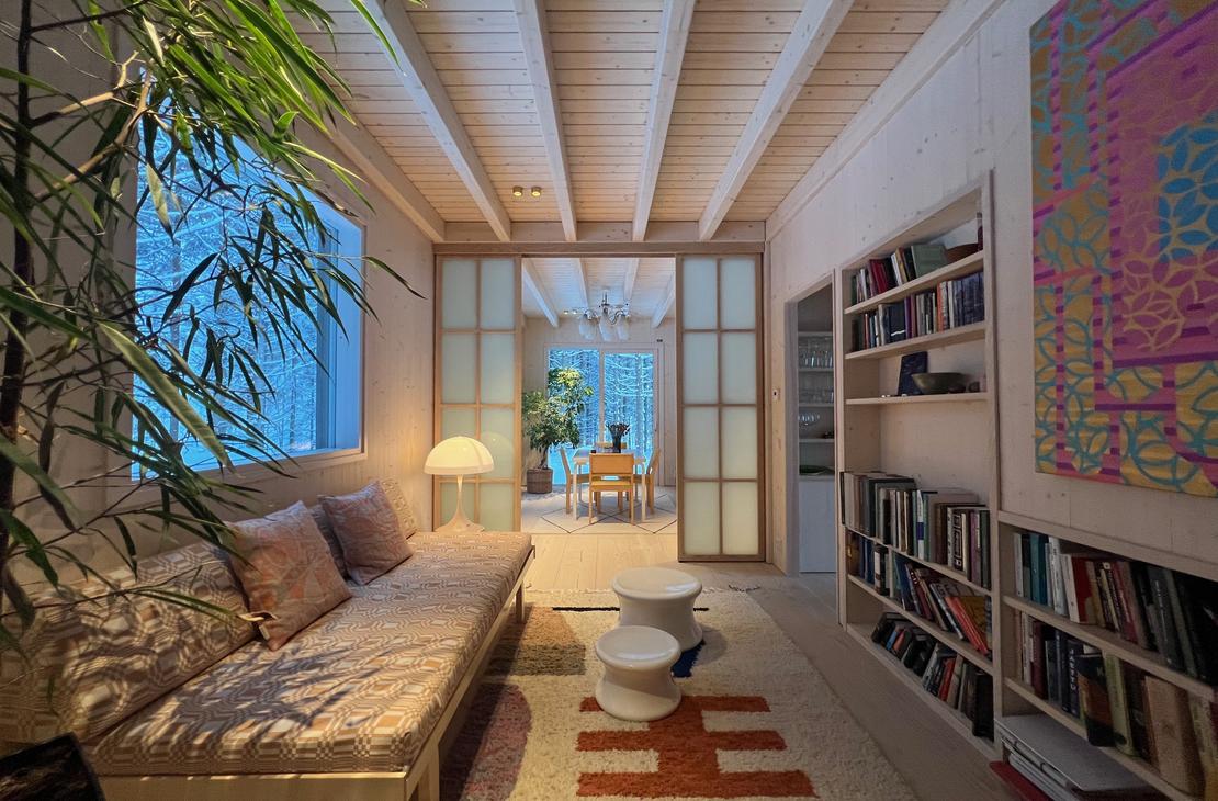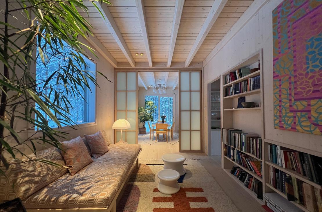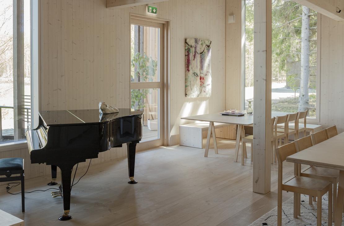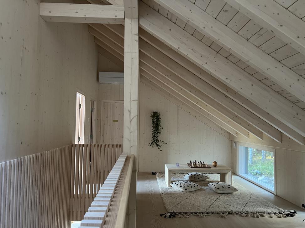 Constructed entirely of sustainable Finnish wood, the building’s materials are sourced from the region. Wall panels come from Crosslam’s Kainuu factory, while the downstairs ceilings are crafted from spruce trees felled on-site and processed by a local sawmill.