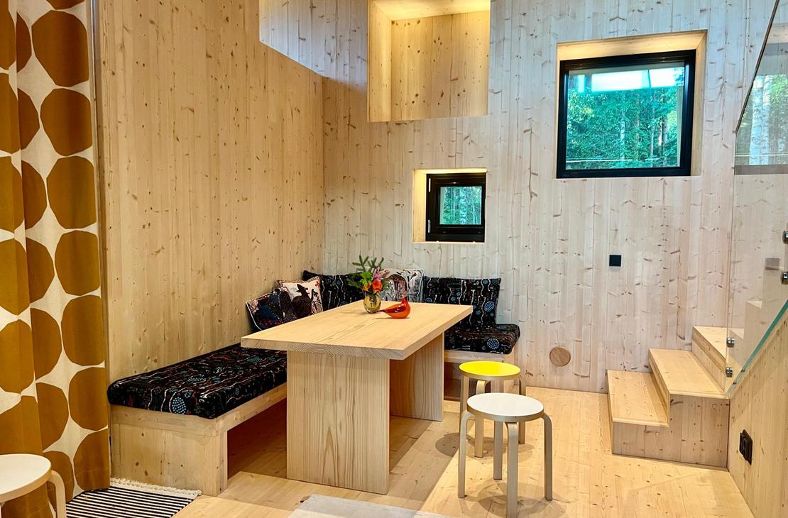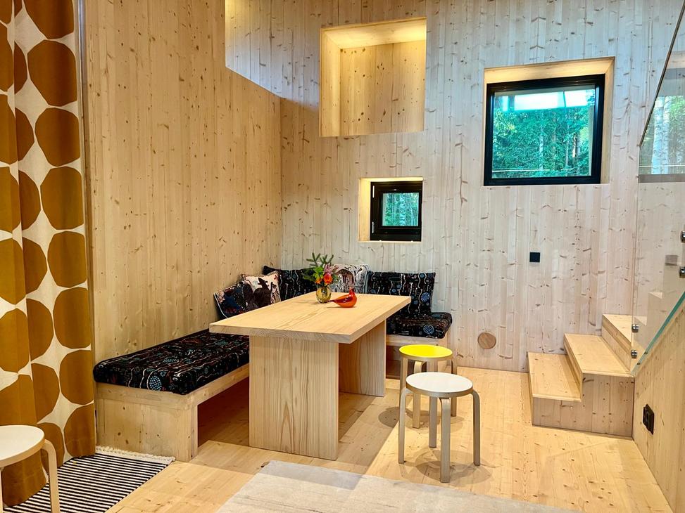 The UFO Mini-House’s interior showcases impeccable craftsmanship, including a hand-crafted kitchen island and built-in solid wood cabinets and drawers for storage. The minimalist yet elegant design features Nikari wooden chairs, a traditional rya rug, and velvet curtains that enclose the sleeping alcove.The cozy sleeping area includes a 140 cm wide double bed, down duvets, and pillows, ensuring comfort in a serene and luxurious environment.