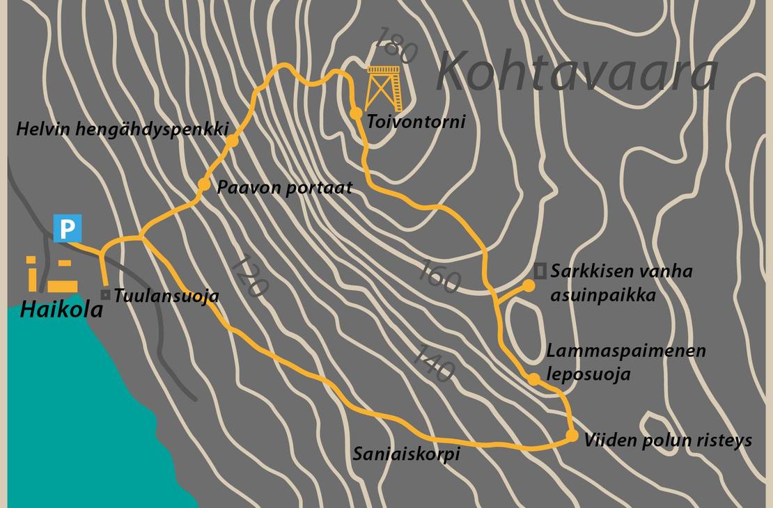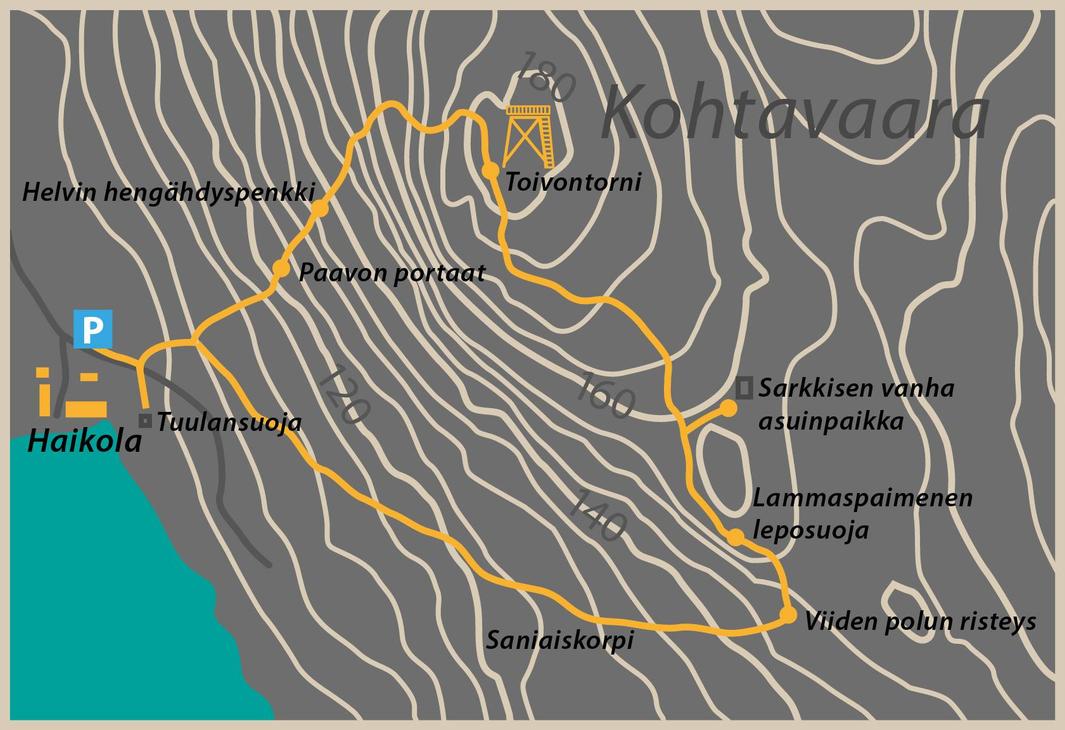 There are signs along the route with information about the history and nature of the area. The signs also have QR codes that you can use your smartphone to search for additional information. “Paavo’s stairs”, “Helvin hengähdyspenkki” and a rope installed at a steep point make the climb easier.