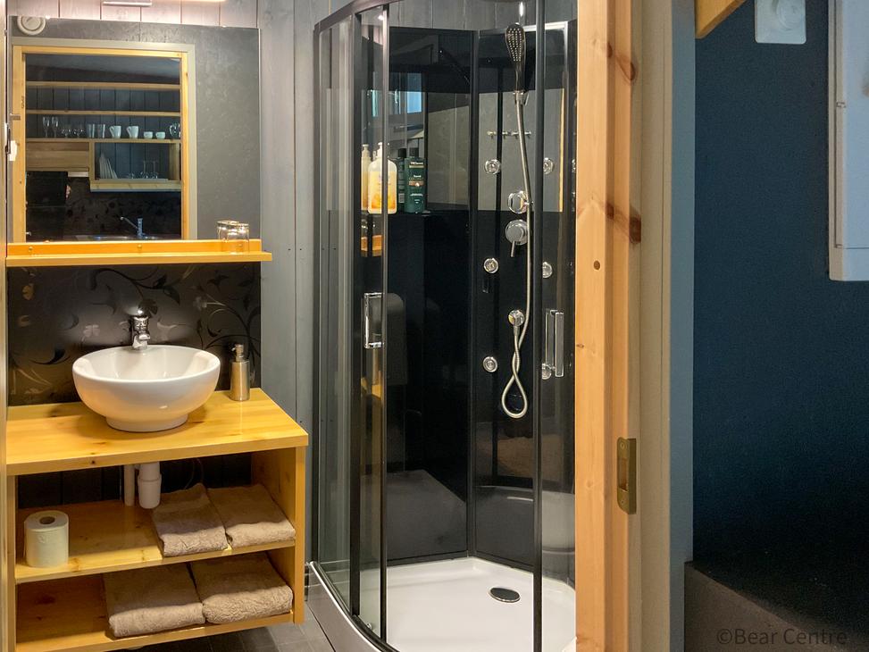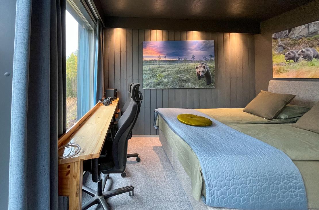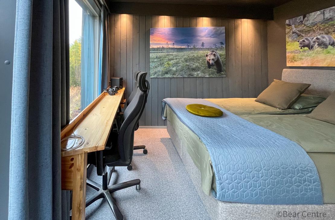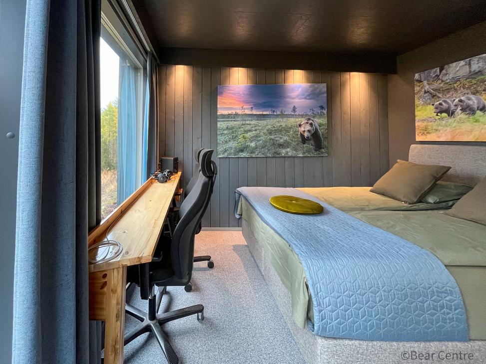 Mökissä on kaikki mukavuudet; lämmitys, ilmastointi, wc/suihku, pieni keittiö astioineen, parisänky, liinavaatteet. Karhumökkimme ovat yksi maailman parhaista paikoista tarkkailla karhuja. Todennäköisyys nähdä karhu on suuri, 90-99% kuukaudesta riippuen. Joinakin iltoina voi nähdä jopa useita karhuja samaan aikaan. Lähimmät karhut voivat olla vain muutaman metrin päässä mökistä.