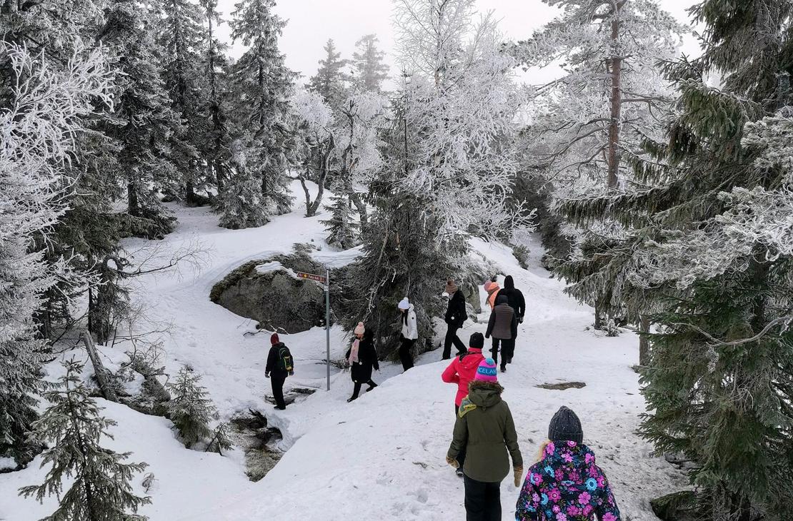 Talvinen kävelyretki Kolin kansallispuiston näköalapaikoille tehdään turvallisesti liukuesteillä.