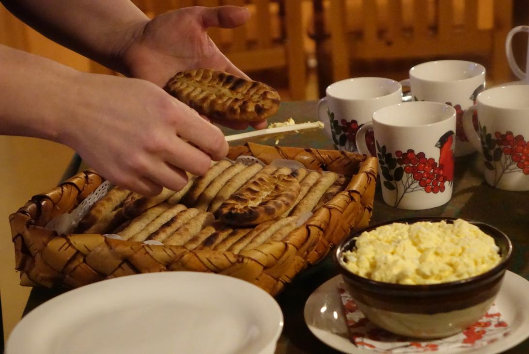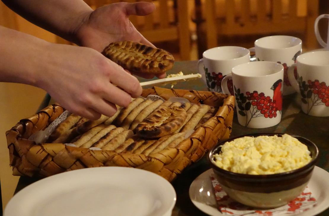 Karjalanpiirakat ja munavoi, mallasleipä ja voi