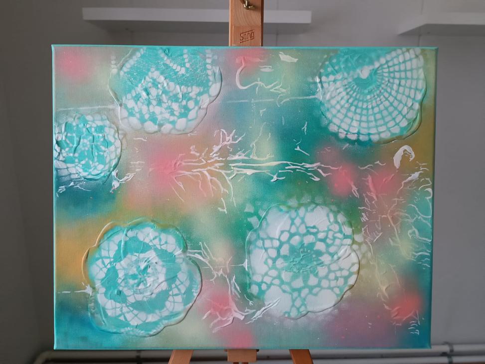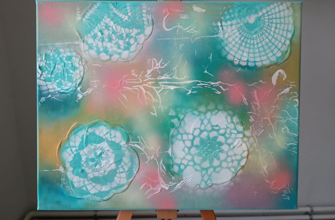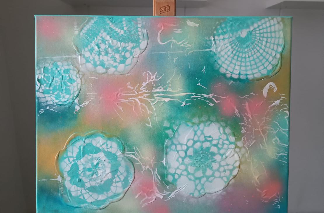 Tekstuuria ja maalauksessa käytetty kuvion luomiseen vanhoja pitsiliinoja.