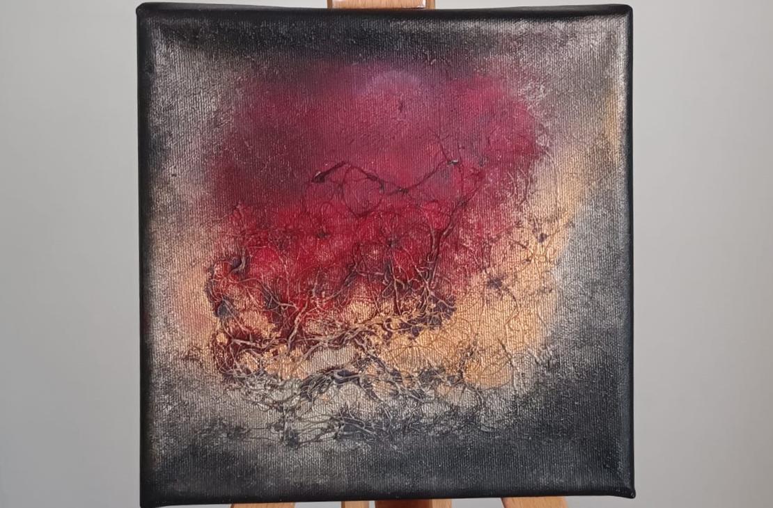 Metallinhohtomaalia sekä tekstuurina langanpätkiä.