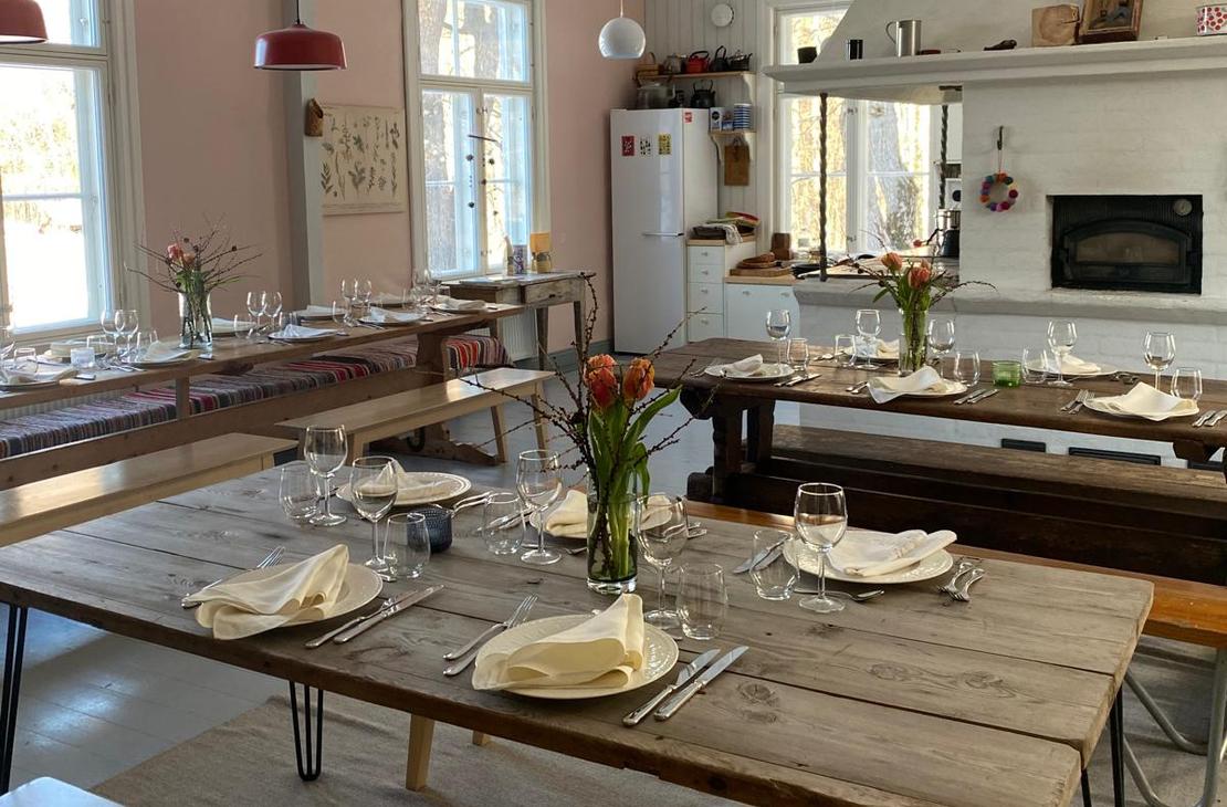 Vieraat istuvat pöydän ääreen vanhassa kartanossa, kynttilöiden loisteessa, leivinuunin lämmössä ja metsän tuoksujen keskellä.