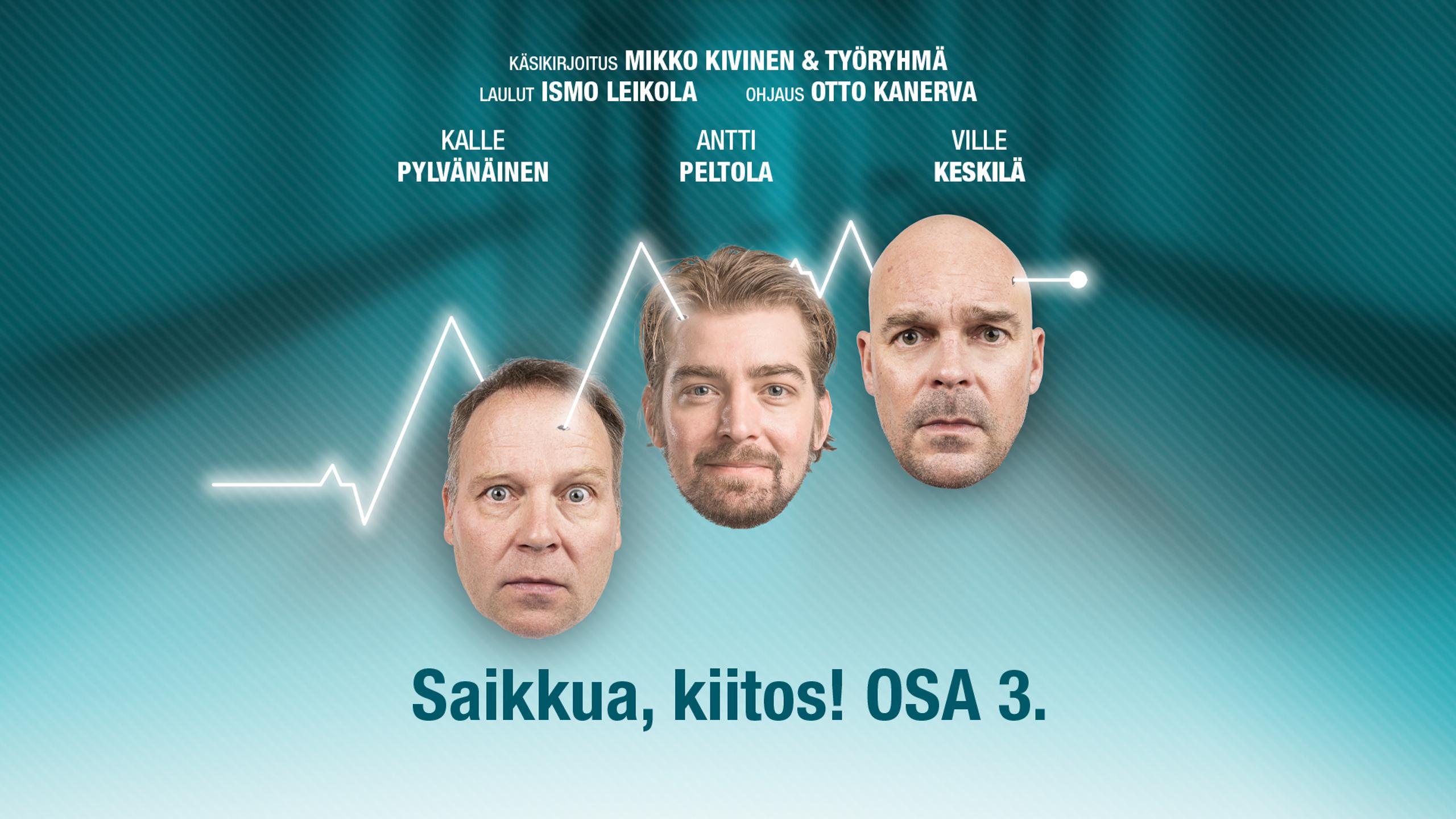 Koko Saikkua, kiitos! -trilogia on nähty ympäri Suomen yhteensä yli 1 000 kertaa ja se on lumonnut yli 500 000 katsojaa! Tämä on komedian voimaa! Suomalainen terveydenhuolto lääkäreineen ja potilaineen on todellinen runsaudensarvi, josta riittää aina uutta kerrottavaa. Kolmas osa todistaa, että terveydenhuollon arki on paras lähde hervottomalle sketsihuumorille.