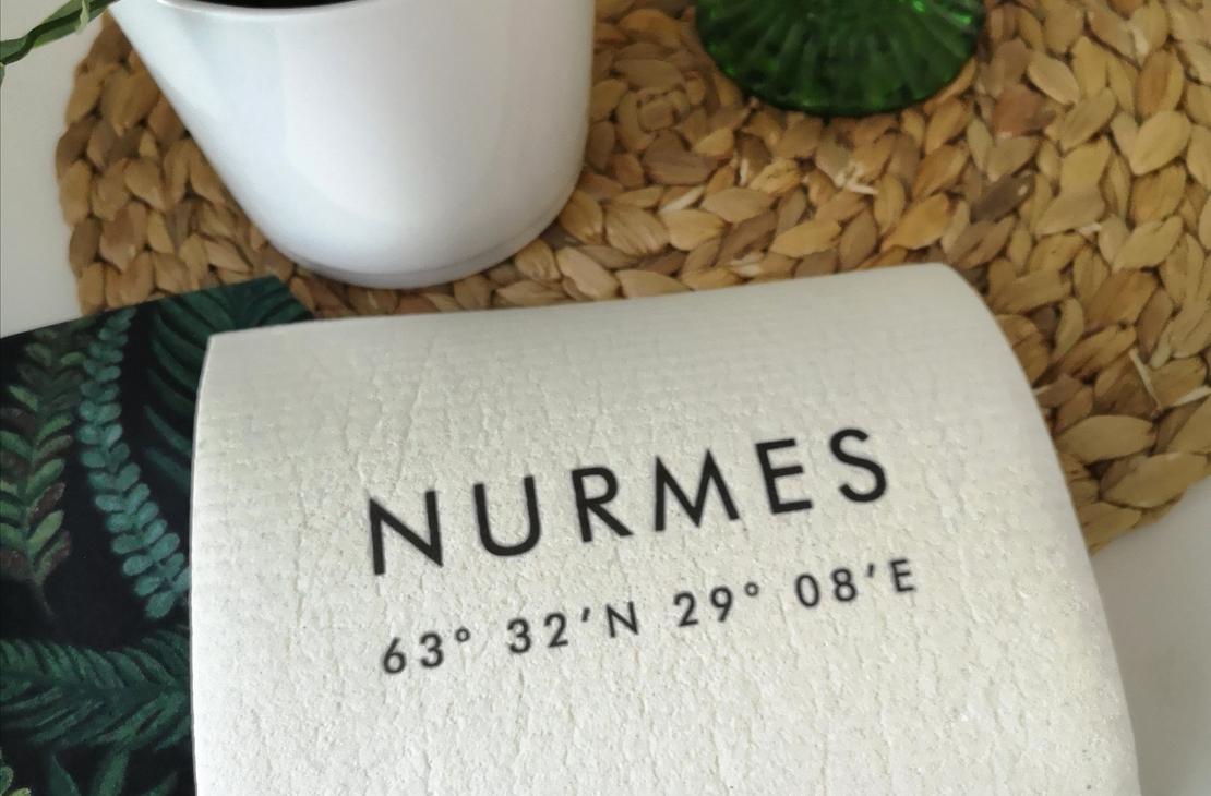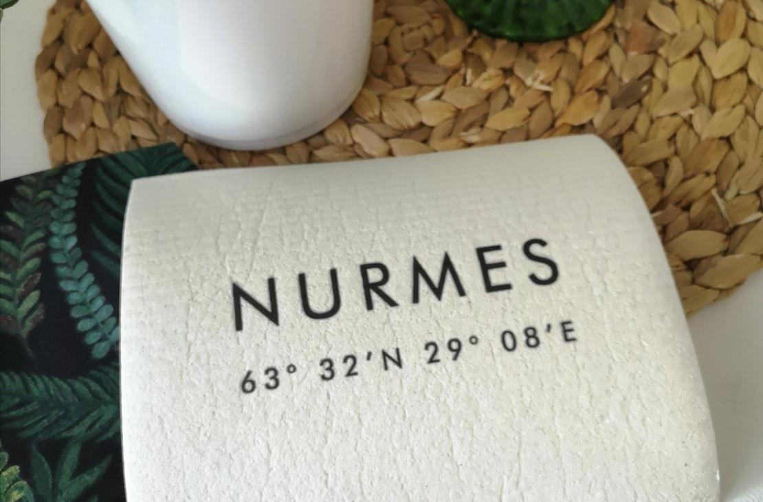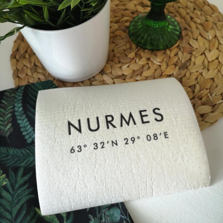 • Biohajoava ja kompostoitava tiskirätti, johon painettu Nurmes ja koordinaatit